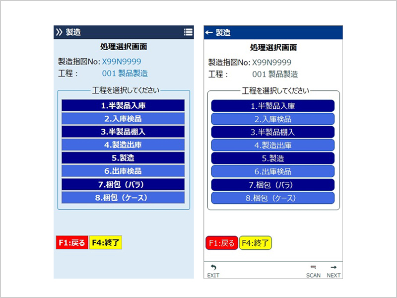 RFgenの機能内メニューを活用し、業務フローに沿った画面遷移とメニュー構成を実装しました。作業者は、画面に表示される順番どおりに操作するだけで、正しい手順で作業を進めることができます。これにより、作業手順を意識せずとも、システムが自然に正しい作業フローへ誘導します。